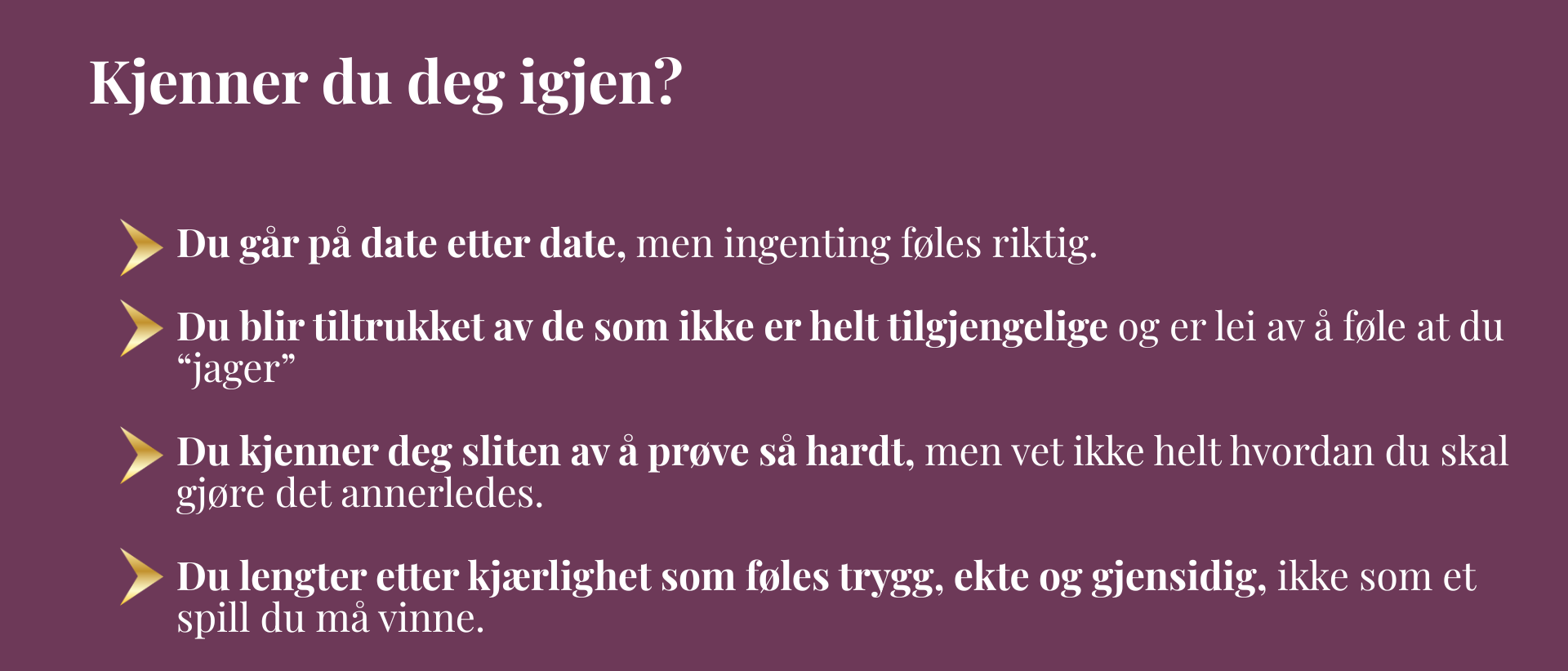 I dette webinaret vil jeg vise deg nøyaktig hvordan du tar styringen over kjærlighetslivet ditt og dater på en måte som tiltrekker rett partner, uten å jage eller miste deg selv i prosessen.